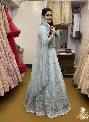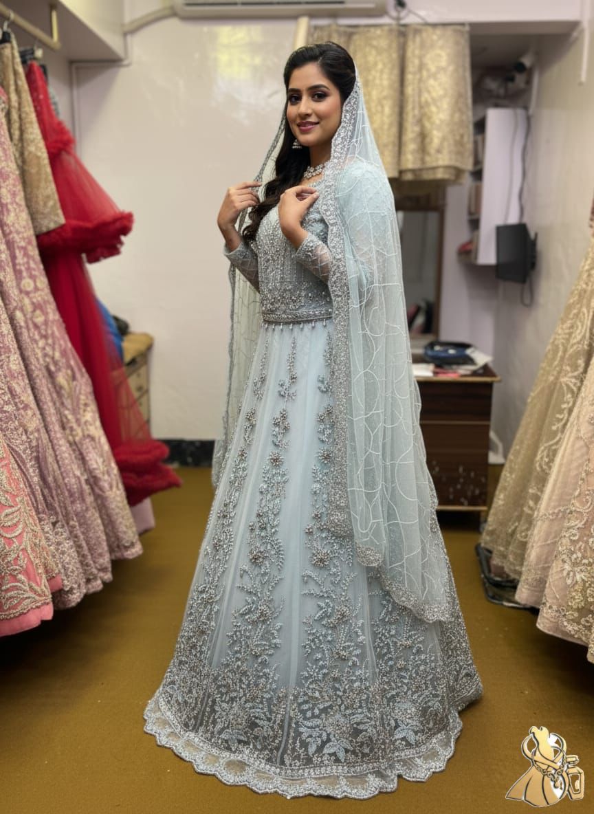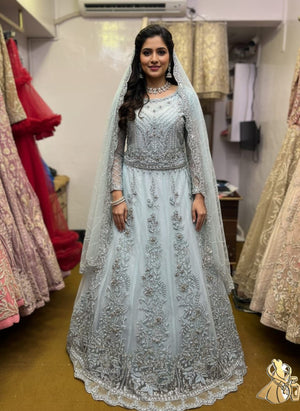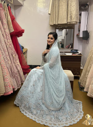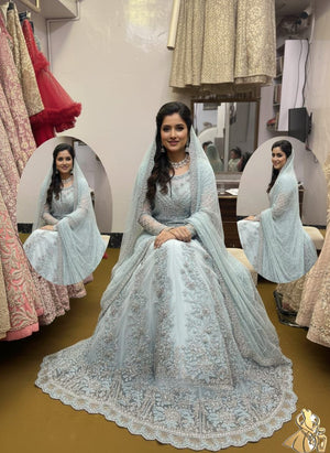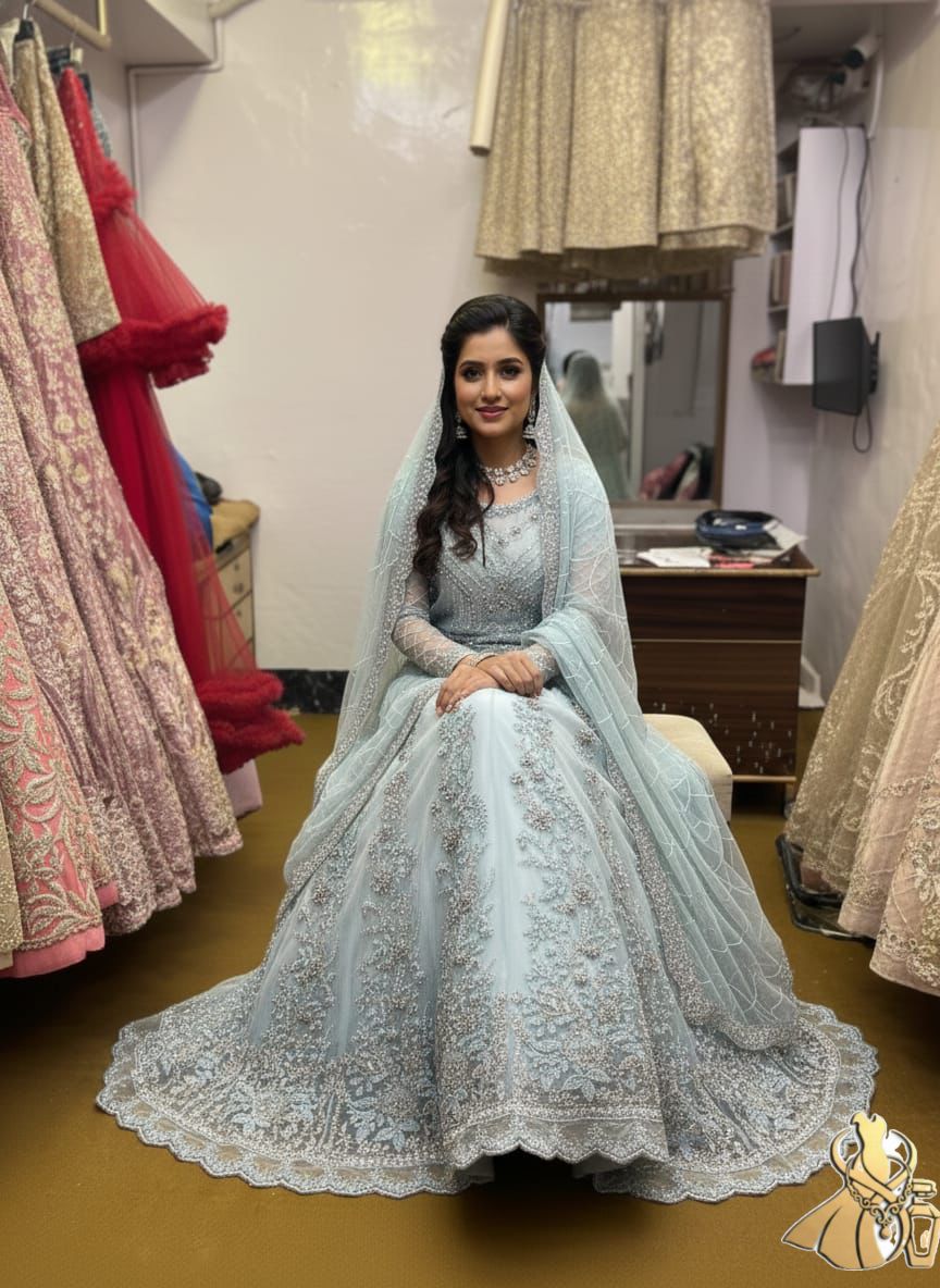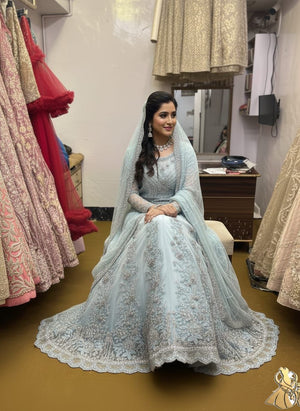 Yeh dilkash Ice Blue/Asmani rang ka gown aapki shadi ki rasmon ya kisi bhi bade event ke liye bilkul perfect hai.