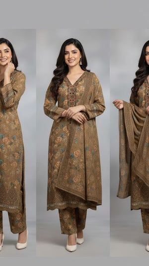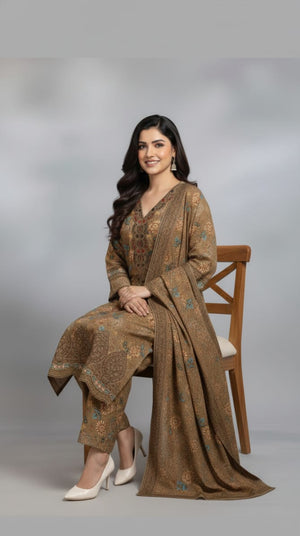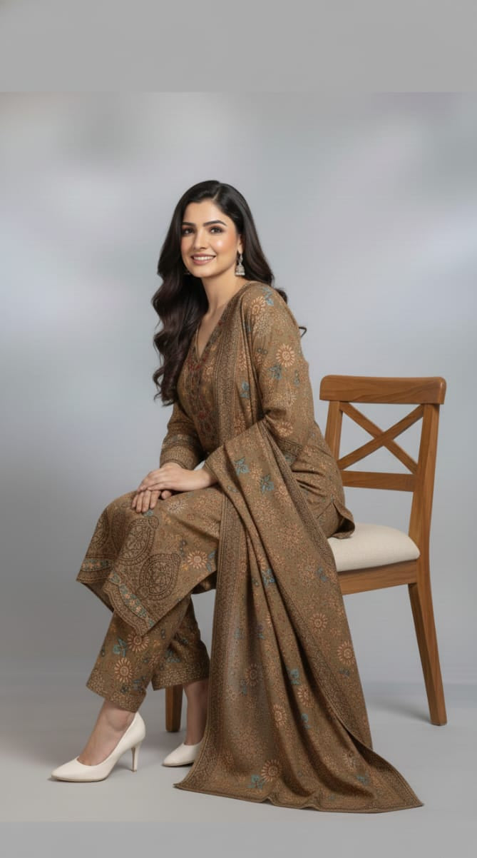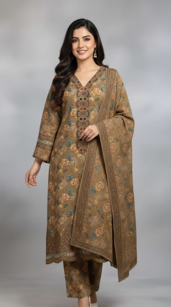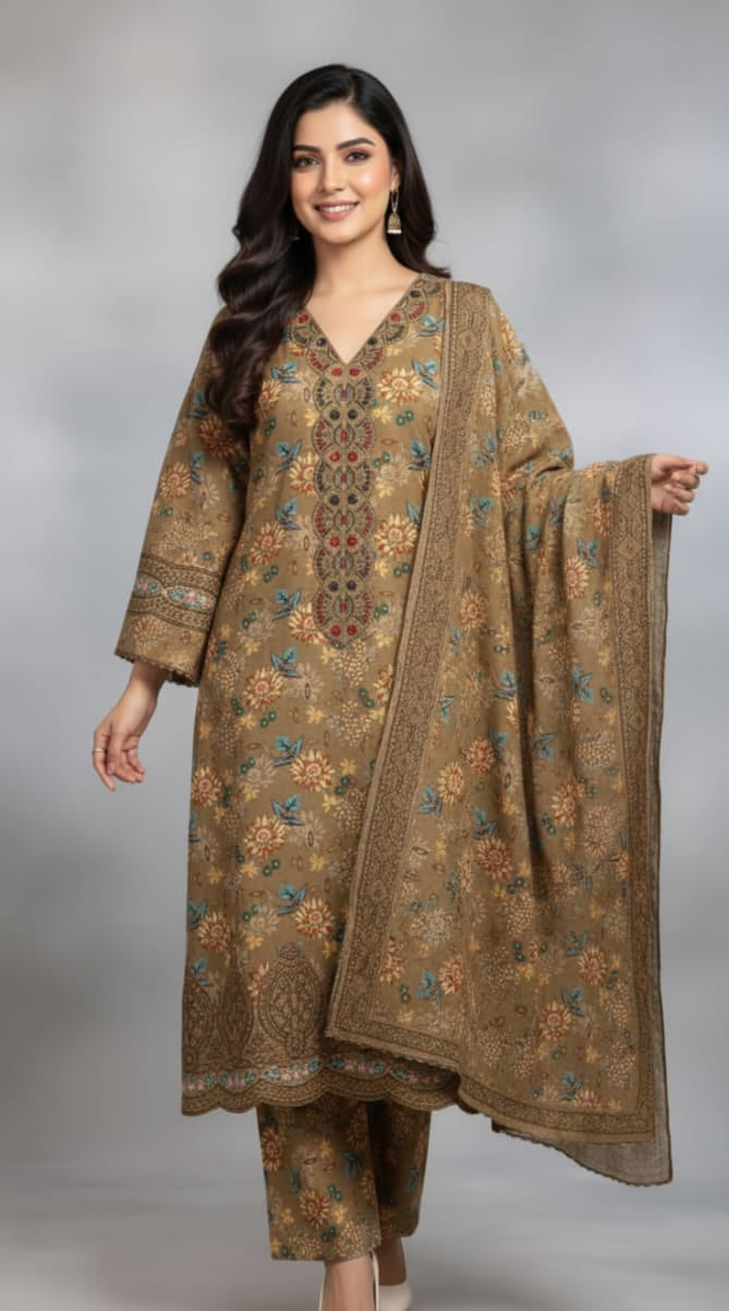 Step into the new season with this stunning 3-piece Khaddar/Lined suit, designed for both warmth and unmatched style. The rich khaki base is beautifully complemented by vibrant floral patterns, making it an exquisite addition to your winter wardrobe.