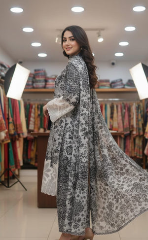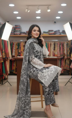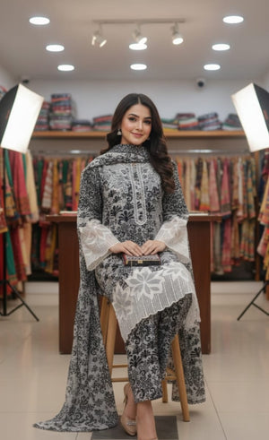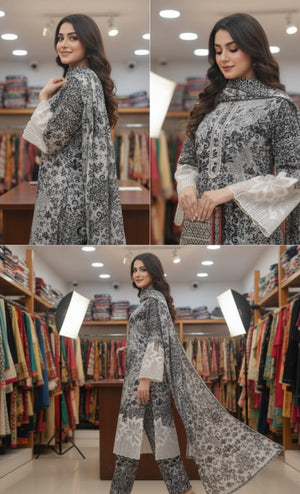 Elegant Monochrome: Premium 3-Piece Printed Winter Linen Suit