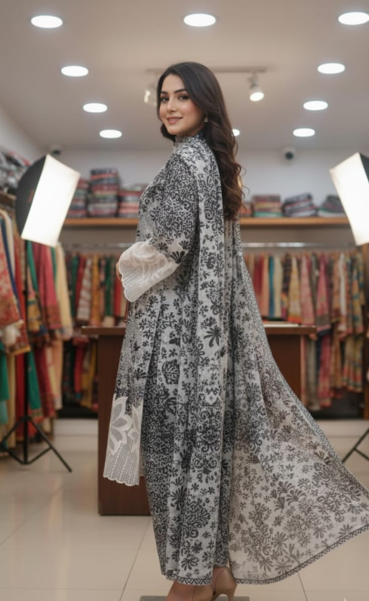 Hamari Winter Collection ka yeh anokha 3-Piece Suit aapke wardrobe ko ek naya rang dega. Safed aur kaale (white and black) ke khoobsurat floral prints aur nazuk (delicate) lace work ke saath, yeh design modern aur traditional style ka behtareen (best) mel hai.