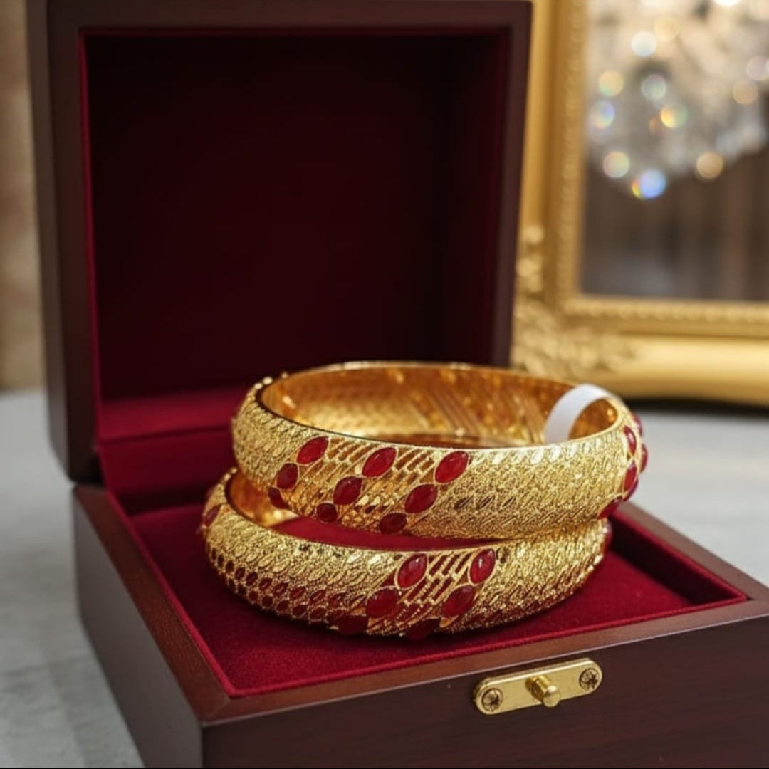 Indulge in timeless sophistication with this stunning pair of gold-plated bangles adorned with vibrant red gemstones. Crafted with intricate textured detailing and a luxurious polished interior these bangles sit elegantly in a velvet lined wooden gift box perfect for adding a touch of regal charm to any outfit or gifting occasion. ✨