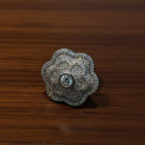 This exquisite ring features a flower-shaped design crafted with a textured silver tone metal likely stainless steel giving it a sparkling, diamond encrusted appearance The surface is adorned with tiny glittering embellishments that catch the light enhancing its elegant look At its center a round, brilliant cut diamond (or diamond-like stone) is set within a bezel setting adding a striking focal point The ring rests on a rich dark brown wooden background with visible wood grain, highlighting its luxurious details Overall, the piece blends intricate craftsmanship with timeless style suitable for formal or special occasions.