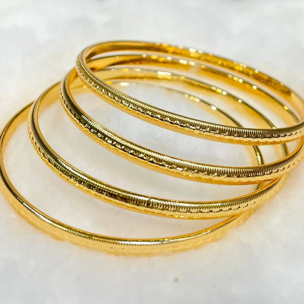 A sleek set of four gold‑colored stainless‑steel bangles featuring a delicate textured ridge along the outer surface for added sparkle. Ideal for everyday wear, these hypoallergenic bangles combine timeless elegance with durable comfort. Perfect for stacking or wearing solo, they complement both casual and formal outfits effortlessly. 🌟