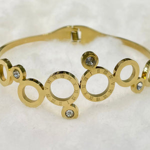 Showcase timeless sophistication with our stunning gold-colored stainless steel bracelet, featuring interconnected circular motifs engraved with Roman numerals and sparkling diamond accents. This Breslite design blends classic charm with contemporary flair, perfect for elevating any outfit — day or evening. Ideal gift for those who appreciate refined details.