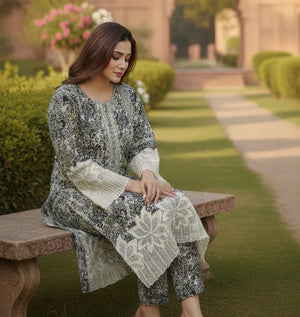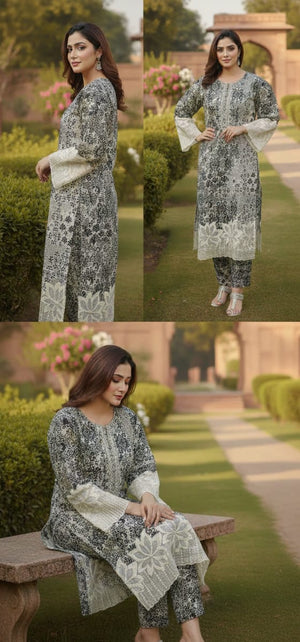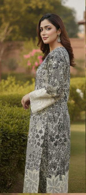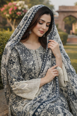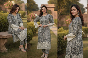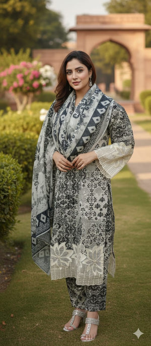 Step into the winter season with unparalleled elegance in this exquisite three-piece ensemble. Featuring a sophisticated grey and black floral print on a warm winter fabric, this suit is a statement of style. The straight-cut long kurta is beautifully accented by delicate scalloped lace detailing along the hemline and stylish flared bell sleeves finished with a sheer, intricate border. Paired with matching printed trousers and designed for a comfortable yet luxurious fit. Perfect for winter gatherings, evening events, or semi-formal occasions.