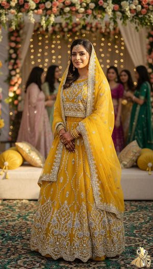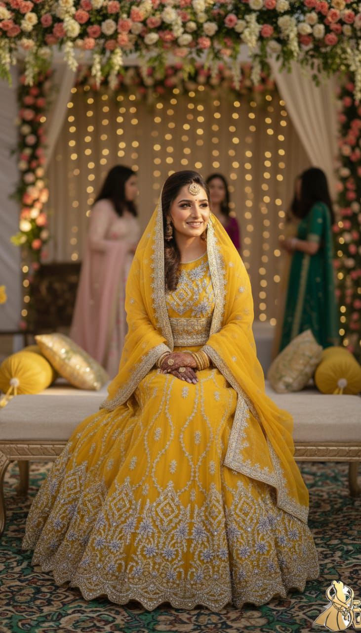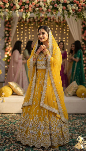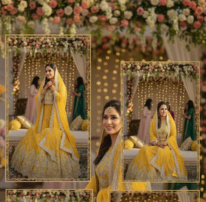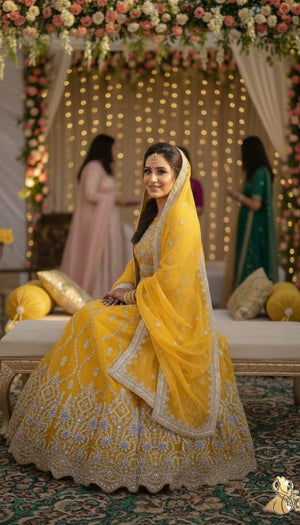"Jab rang baat karein khushiyon ki. 🌼 Yeh dress sirf kapra nahi, balkay shadi ki wo feel hai jo tasweeron mein jaan daal deti hai. Realistic look, perfect fit, aur wo chamak jo sab ko yaad reh jaye."